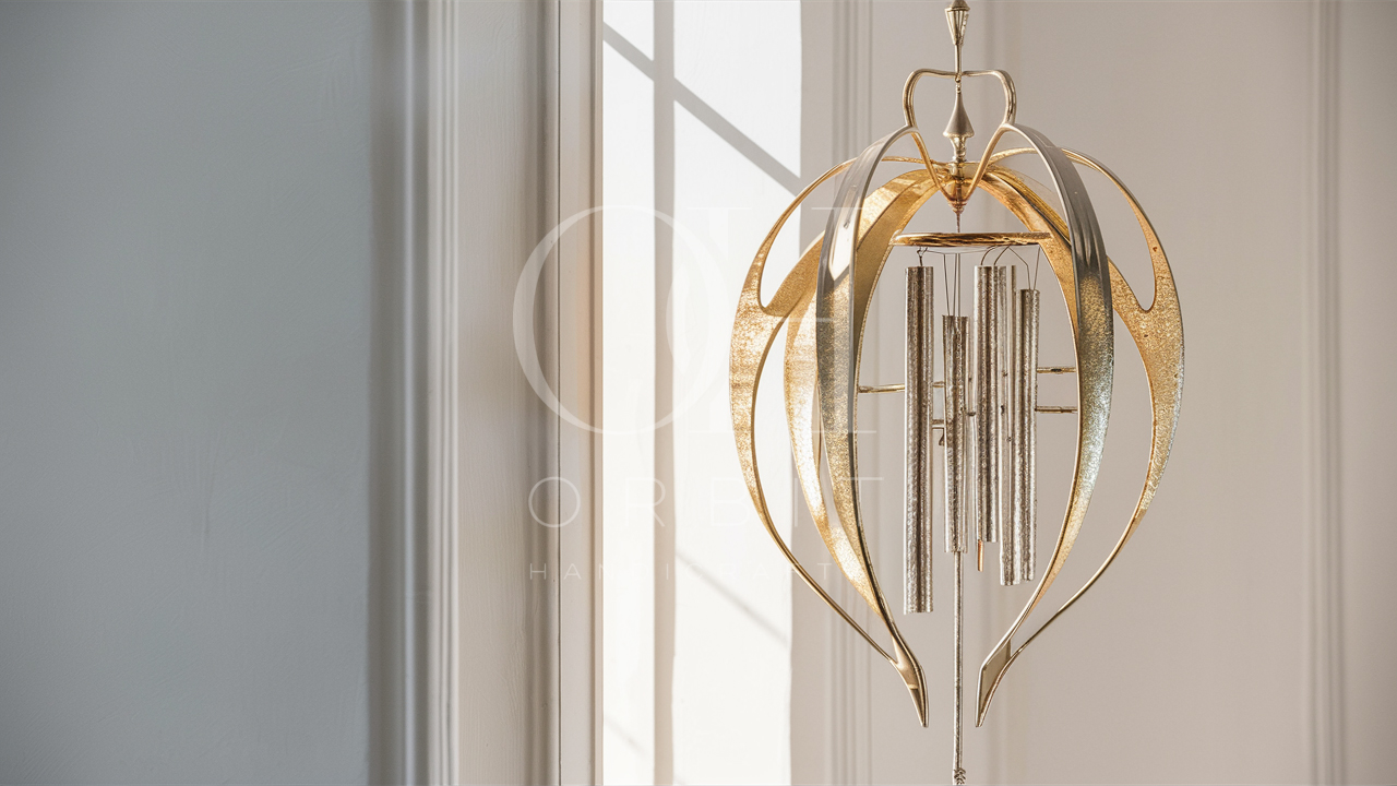 Elevate your outdoor living experience with the enchanting beauty and soothing melody of the Designer Gold Abstract Wind Chime from Orbit Handicrafts.