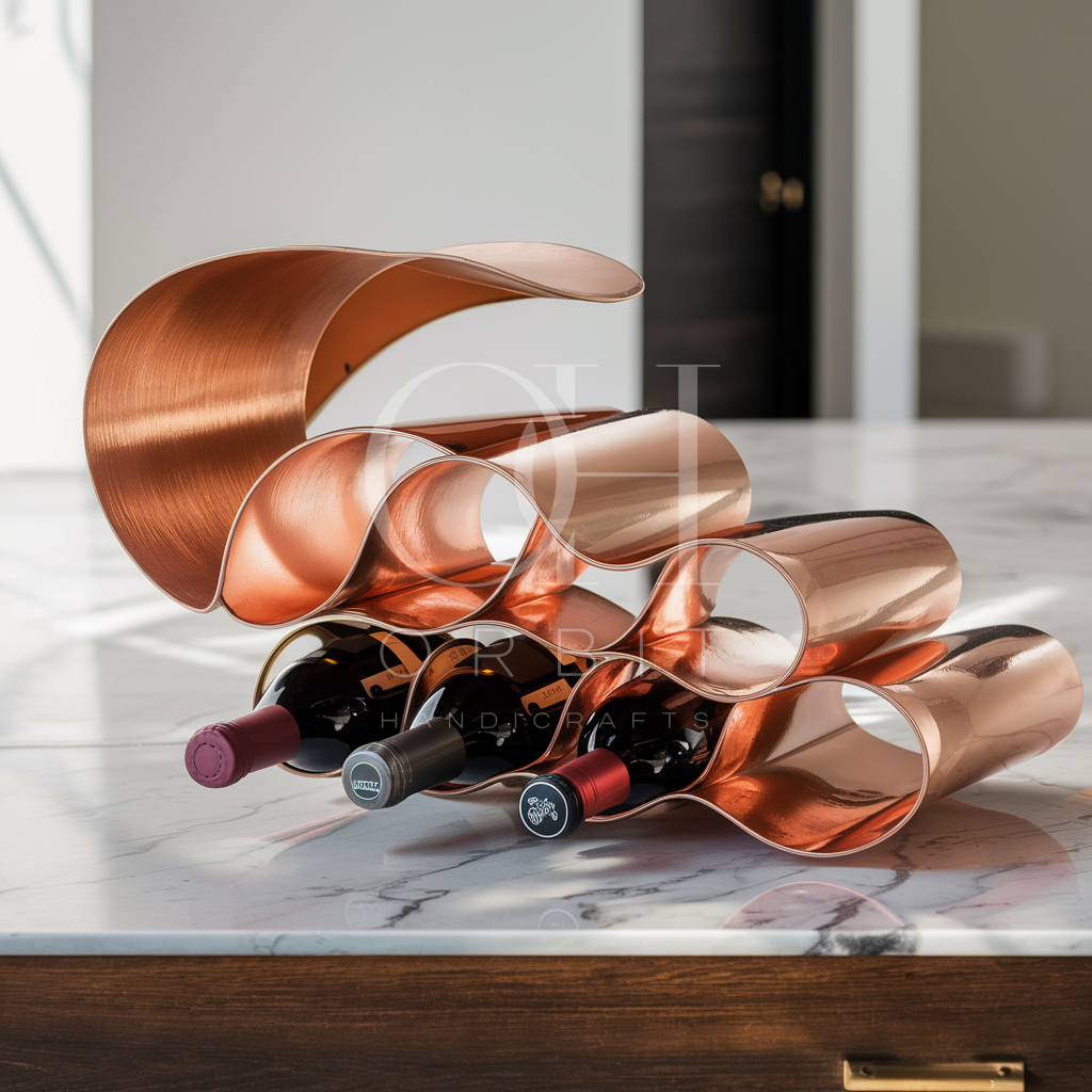 Introducing the Luxurious Rose Gold Ripple Wine Rack by Orbit Handicrafts, a stunning and contemporary piece that elevates your wine storage experience. This wine rack features a single sheet of metal bent into a ripple shape, creating a mesmerizing ripple effect that adds a touch of modern elegance to any space. Set against a pristine white backdrop and illuminated by natural light, the wine rack exudes sophistication and style.
