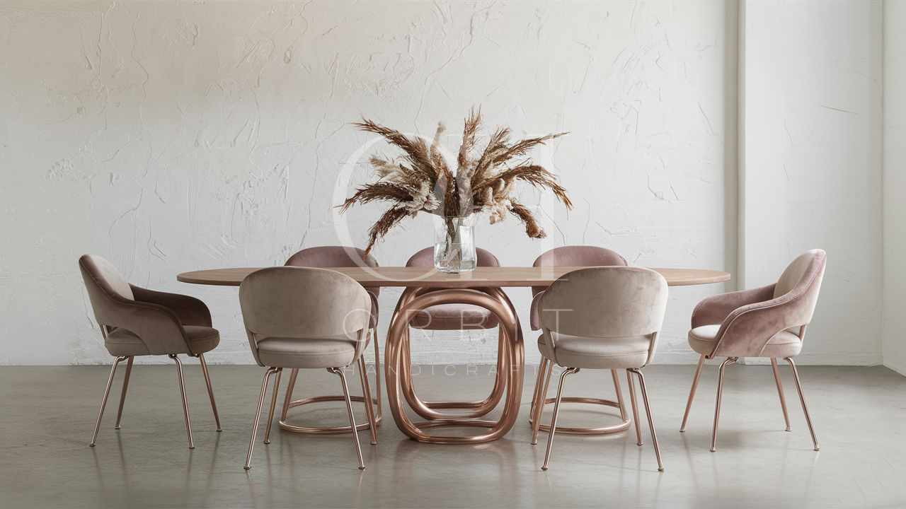 The Orbit Dining Table is a design masterpiece, evoking celestial wonder. The undulating base, reminiscent of the Design, is meticulously crafted. The warm tones of copper add a touch of luxury to any dining area.